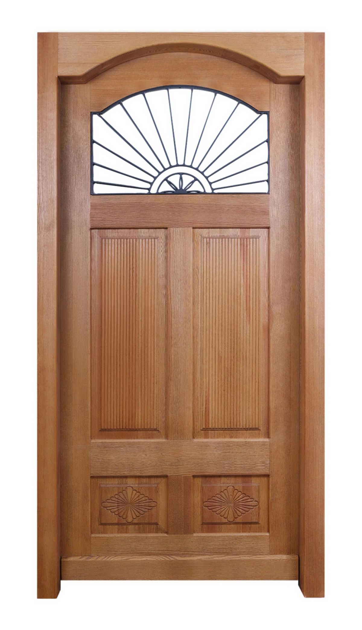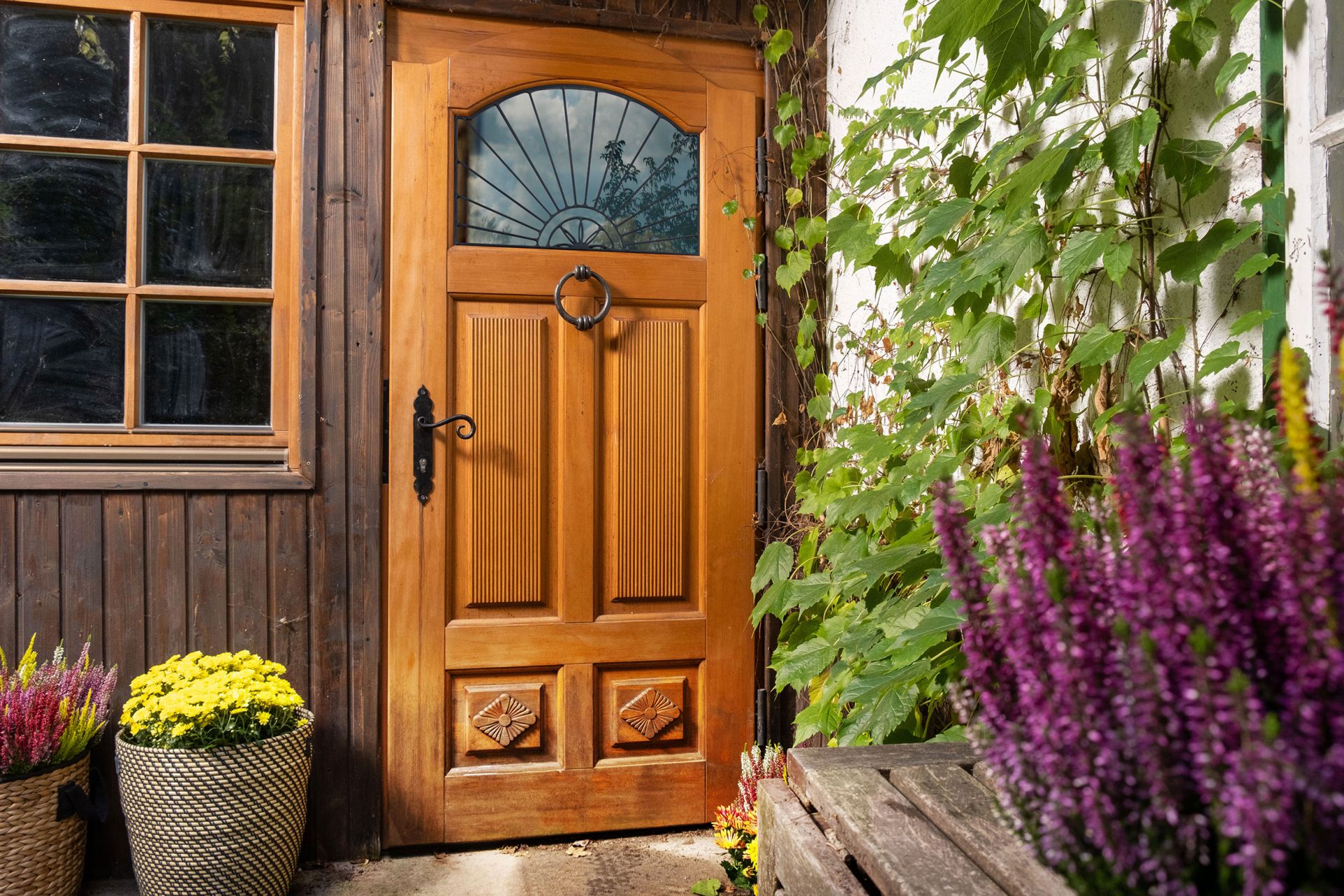 Carinthia door design originates from 18th century southern Austria. Engravings on the door show the four fundamental elements of life: air (the sky arch), sun, water (rain), and Earth (flora) at the bottom. The design symbolizes natural harmony and celebrates the life. The positive story it tells has made this style a beloved choice for home doors across Central Europe.