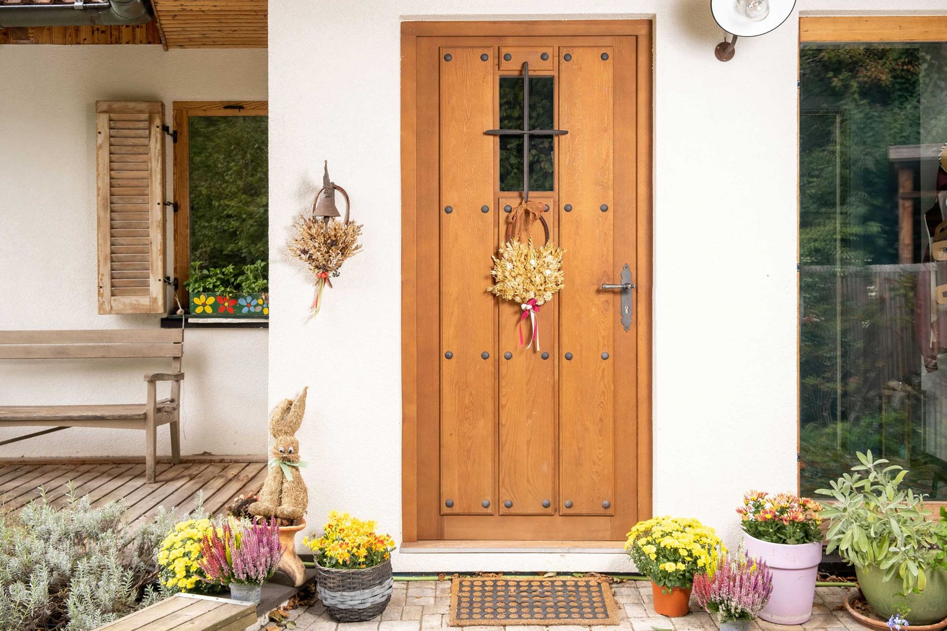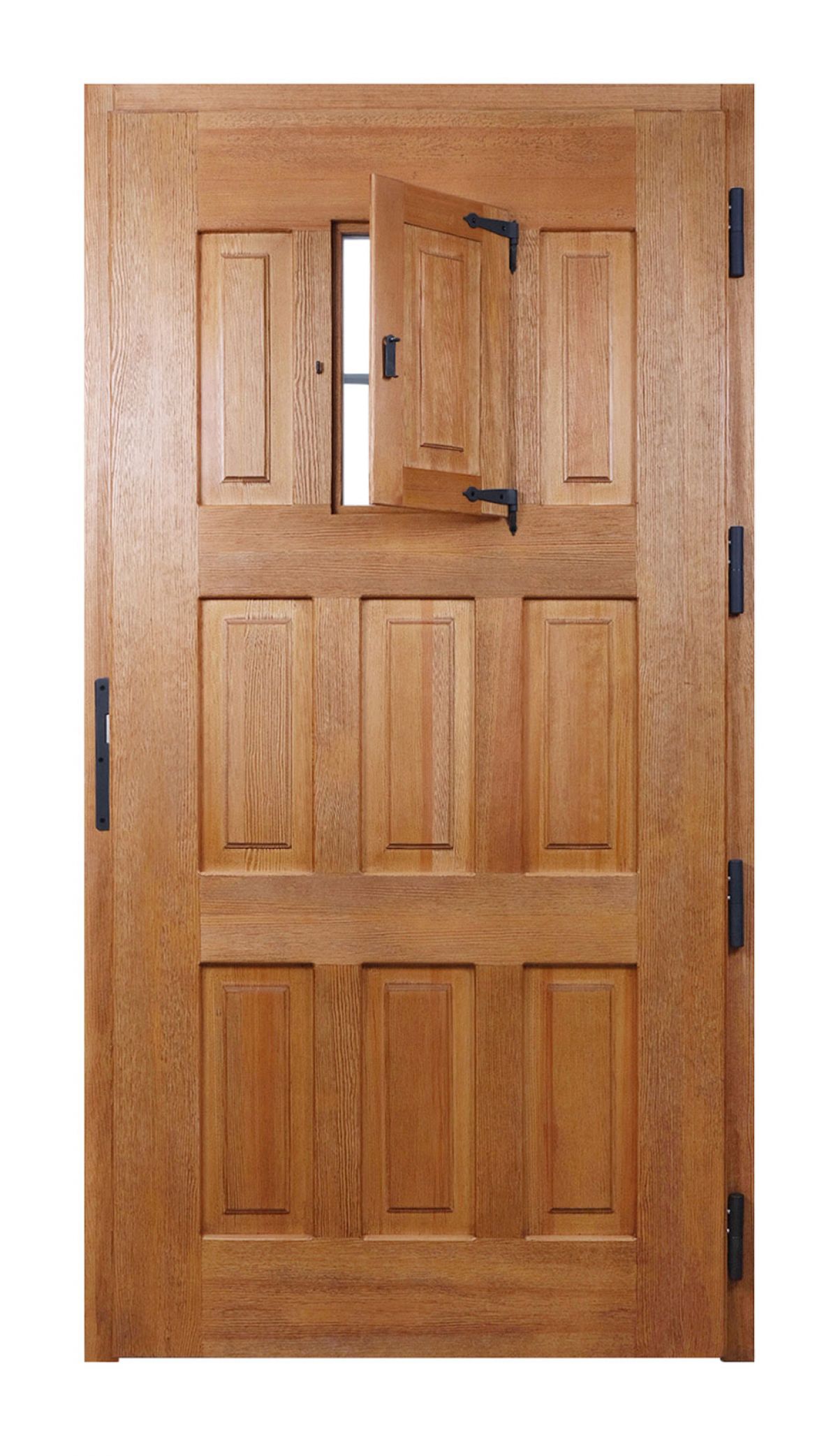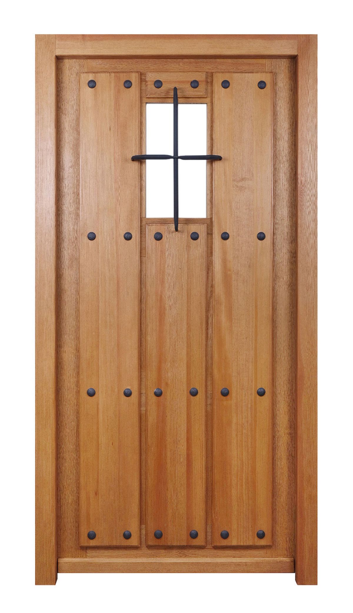This beautiful rustic door design traces its origins back to the 16th and 17th centuries, when it was commonly used for the entrances of fortresses and monasteries. The Granada door is characterized by four longitudinal and transverse friezes and massive wooden deck boards, delivering a sturdy and robust feel. Decorative iron nails add to the strength, along with the iron grid covering the small window.